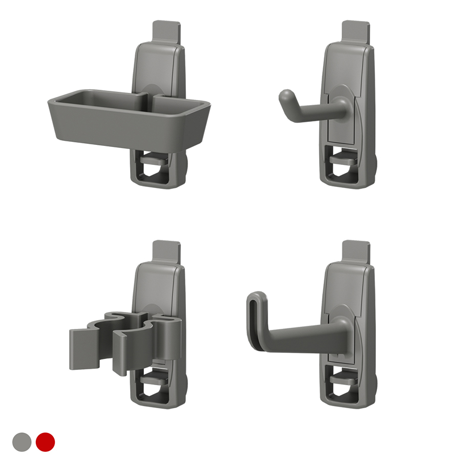 塑膠掛鉤提供紅、灰兩色選擇,並有多種鉤型,應用多元廣泛,垂直收納能有效增加作業收納空間,需搭配天鋼方孔掛板使用